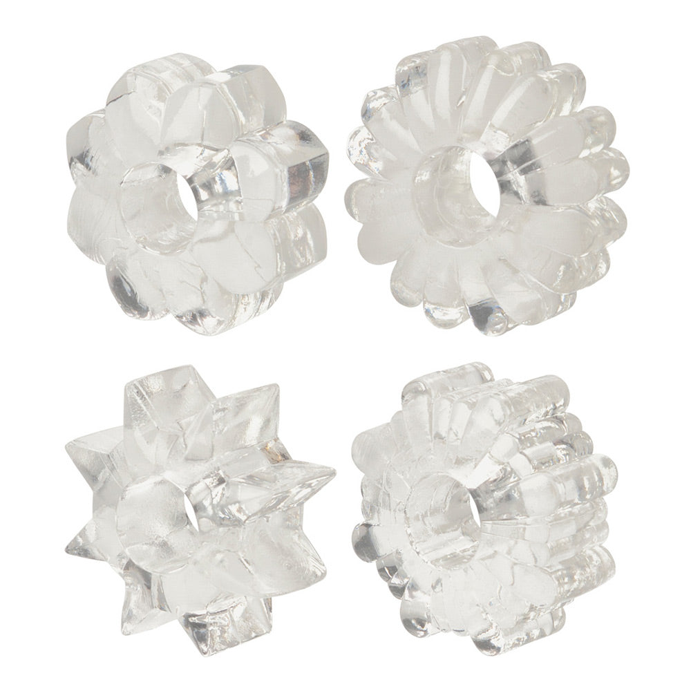 Boasting four uniquely designed TPR enhancers designed to give your mate the thrill of a lifetime… every time! Each fabulously soft and squishy ring is super stretchy, accommodating even the biggest of boys…or toys! And each cock ring also boasts a unique clitoral stimulator for a variety of sensations to tempt and tease while your rock hard erection is certain to please.