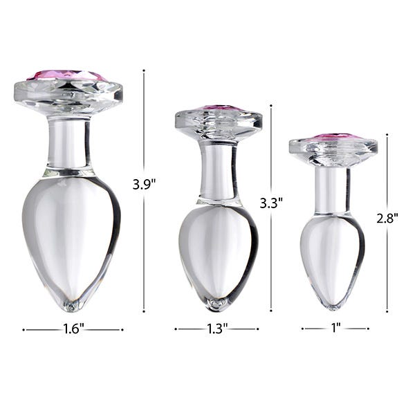 Bedazzle your derriere with this pink gem glass anal plug set. Crystal clear and silky smooth to ensure a pleasurable backdoor experience, the butt plugs come in 3 sizes and provide a satisfying texture that presses firmly against your walls. Simply apply some lube and insert the plug to make your booty sparkle. The bright pink gem adds a touch of allure to your backside, enticing your lover and preparing your booty for some exhilarating play.