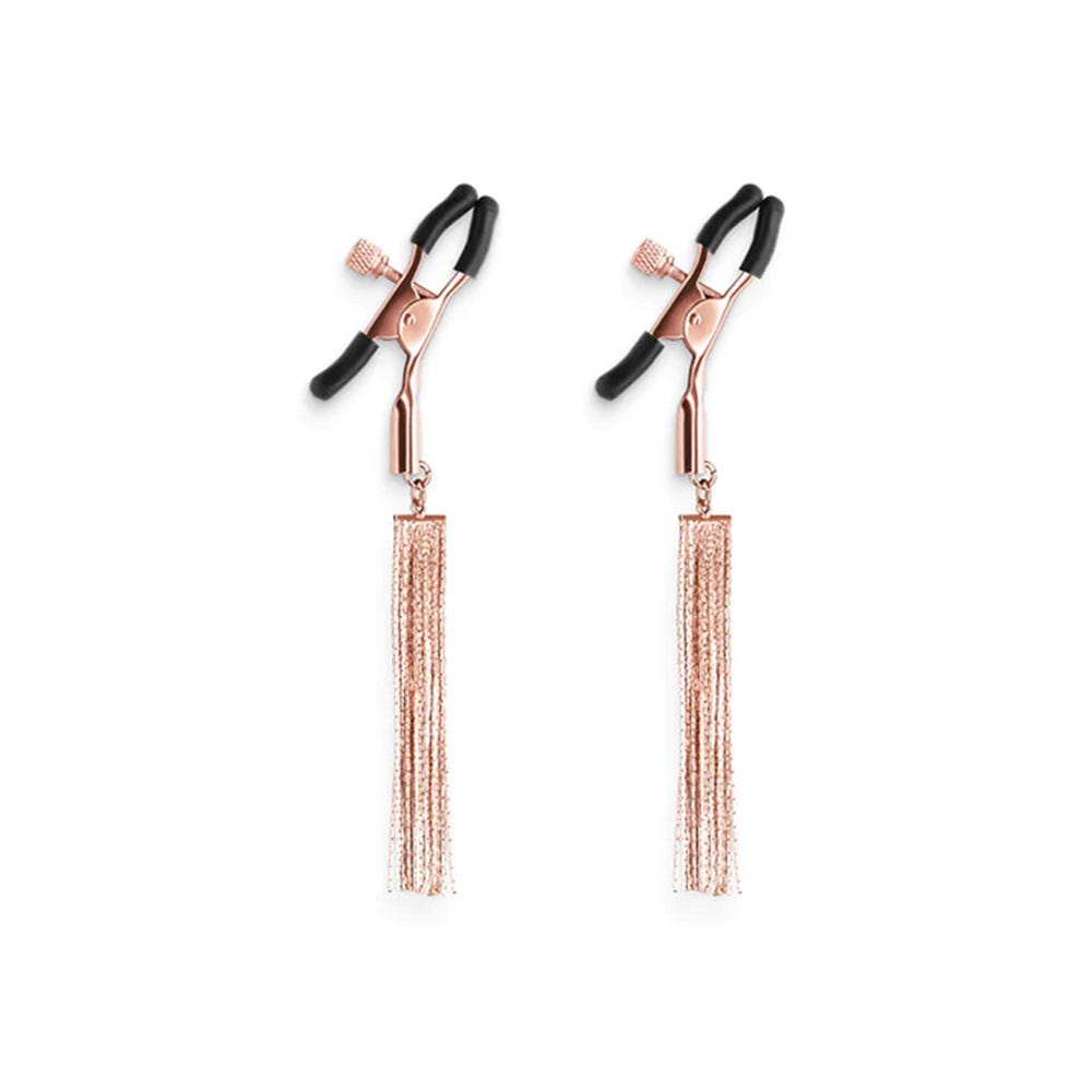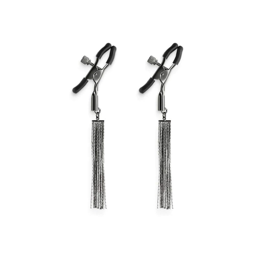 Explore the exquisite balance between pleasure and pain with these captivating nipple clamps. Adorned with shiny, shimmering tassels, they're perfect for those who love to perform sultry tricks. Crafted from nickel-free metal with silicone tips to guarantee superior comfort and a snug fit. Plus, the handy adjustment screw lets you tailor the pressure to your preference, making every moment uniquely yours.