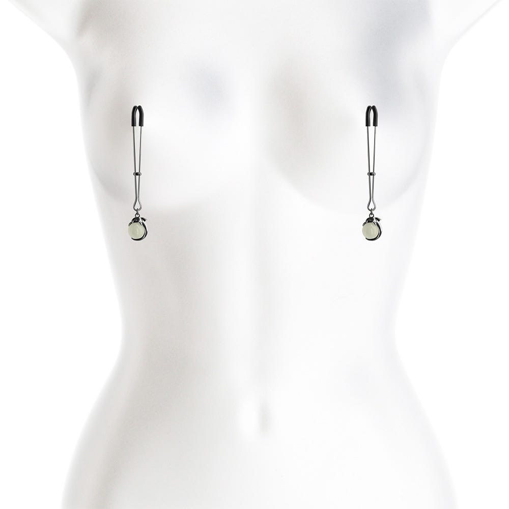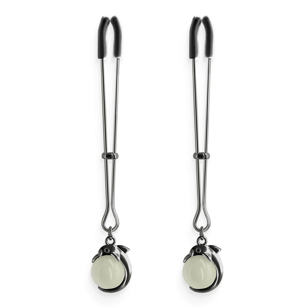 Titillate and tease with Bound's Nipple Clamps 1, an enticing duo of adjustable gunmetal clamps with dangling tri-ball pendants. These comfortable and glamorous clamps provide an exciting new world of erotic indulgence. With sensual silicone-tipped jaws and an alluring swinging pendant design, discover how these nickel-free gunmetal Bound Nipple Clamps 1 can spice up your foreplay.
