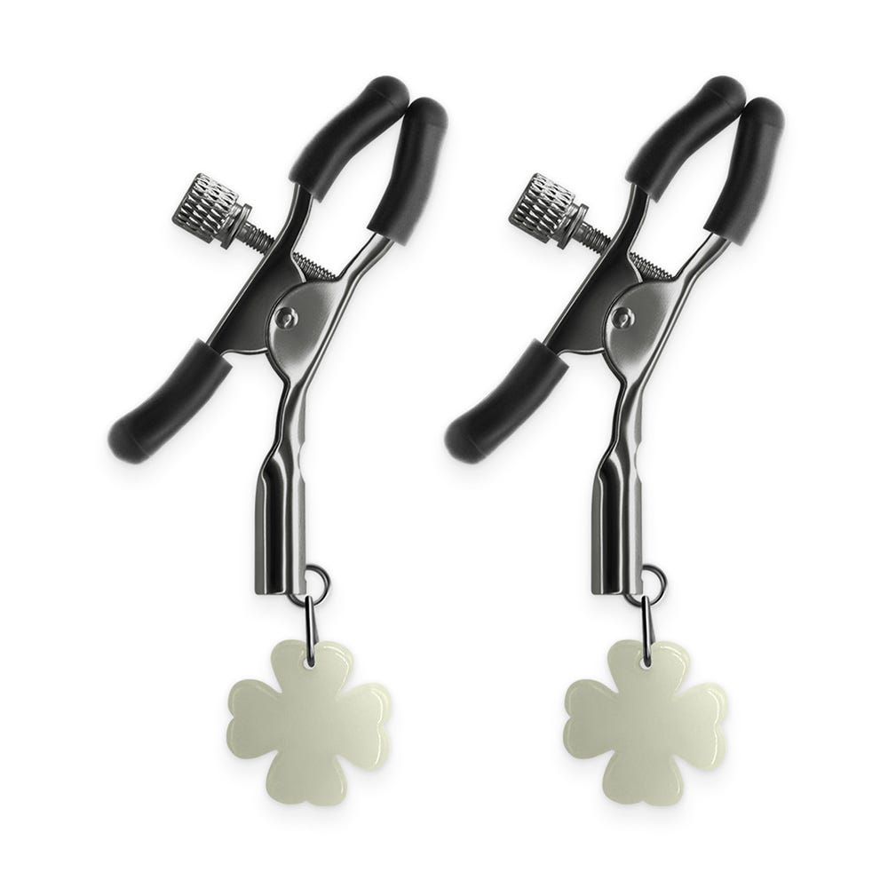 Awaken new passions with these adjustable gunmetal nipple clamps featuring glow-in-the-dark clover pendants for electrifying play. The screw tension controls the pinch while the silicone tips ensure comfort. Enhance intimacy and explore new pleasures with the gunmetal Bound Nipple Clamps 4.