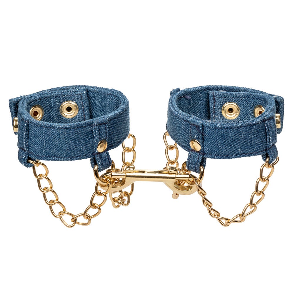 Buckle up for a wild ride with some premium denim wrist cuffs, the perfect accessory your BDSM adventures with an erotic cowfolk aesthetic. Crafted for a snug fit, the Ride 'Em Premium Denim Collection Wrist Cuffs exude sophistication with their denim material and secure snap closures. The dual-ended clasp adds versatility, while universal clasps and D-rings offer freedom in restraining positions. Soft and durable, the cuffs provide comfort and style, enhanced by designer chains for added sensuality. Whether a beginner or enthusiast, indulge in the thrill of restraint play and create unforgettable moments of pleasure and submission.