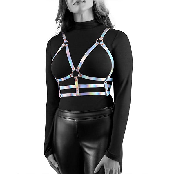 Bewitch those in your orbit with this holographic rainbow harness. Made from easy-to-clean vinyl, this stylish chest harness is accented with rose gold nickel-free hardware and adjustable straps for the perfect fit.