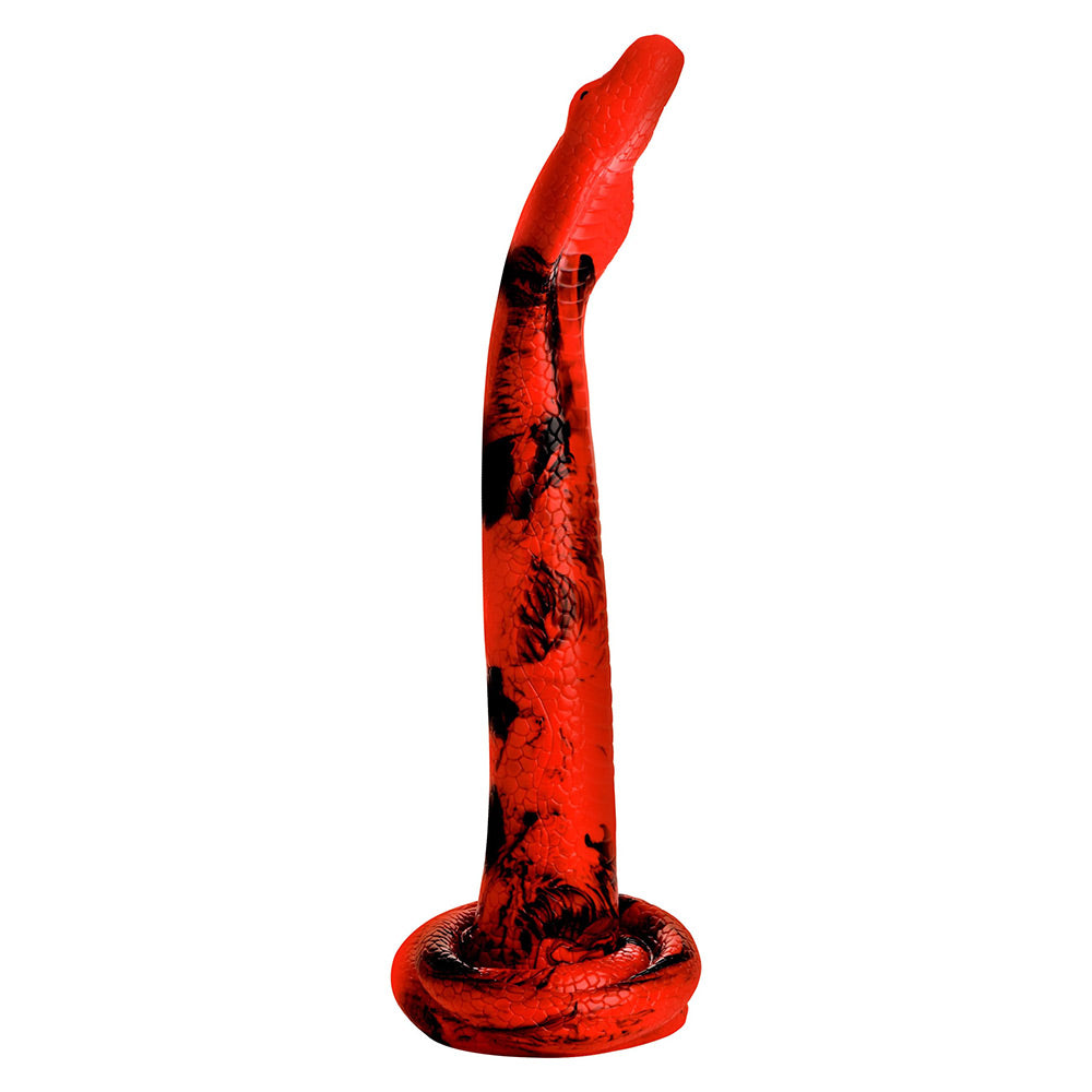 The Creature Cocks King Cobra X-Large 18-inch Dildo is ready to charm its way into your heart... and other places. This magnificent beast boasts 18-inches of scaled satisfaction, with a cobra-head tip more hypnotic than a snake charmer's melody. Its flexible, body-safe silicone shaft undulates with pleasure, while the suction cup base lets you ride hands-free. Harness-compatible for partner play, it's the serpent that'll have you coiling in ecstasy. Just add water-based lube and prepare to be rattled!