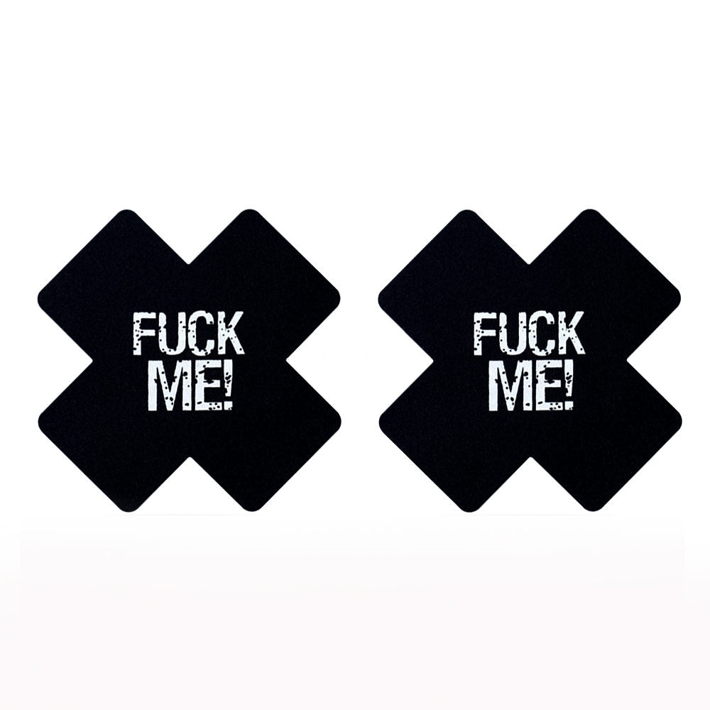 FUCK ME Cross Pattern Nipple Pasties are self-adhesive and hypoallergenic. They can be worn for up to 8 hours wear as nipple cover ups or as a sexy outfit accessory. Disposable for one time use.