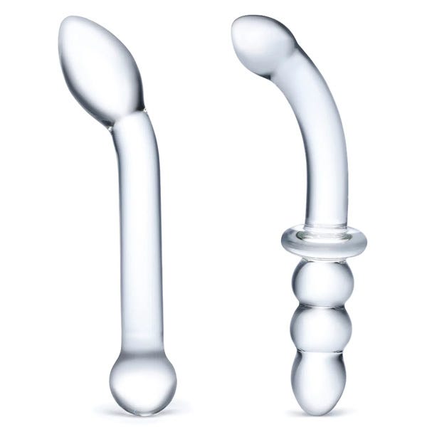 Get the most out of your G-spot exploration with two smooth glass dildos that are curved for targeted stimulation. This set includes a classic G-spot dildo with a bulbous, tapered tip for smooth insertion, and a double-ended dildo with a ribbed end that also serves as an excellent handle. Non-porous, fracture-resistant and hypoallergenic, borosilicate glass is easily cleaned and compatible with all lubricants.