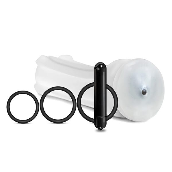 The perfect play companion, with a few (fun) add-ons, this set features a translucent stroker with a non-anatomical textured tunnel. Add extra sensations with every stroke with the included bullet, and three silicone cock rings.