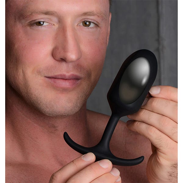 Slide into new sensations with this premium silicone weighted anal plug in large. Designed to delve deep for a satisfying backdoor experience, the round and tapered body allows for easy insertion, while the flexible base and narrow neck move with your buttocks, enabling extended play without discomfort.