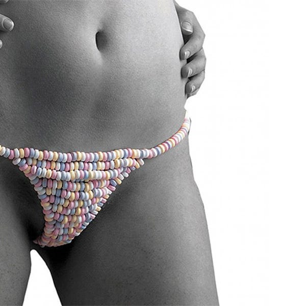 Treat your lover (and yourself) to this deliciously sexy treat. This edible candy G-string is made from sweet candy rings that you can nibble off as you desire, working your way to the sweetest treat of all.