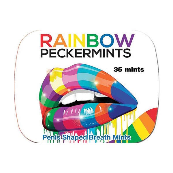 Add a colourful twist to your breath-freshening routine with some rainbow peckermints. These playful penis-shaped breath mints come in a convenient metal tin adorned with some juicy rainbow lips, perfect for on-the-go freshness. Pop one in your mouth and enjoy the refreshing burst of minty goodness. With their cheeky design and vibrant colours, they're sure to brighten your day.