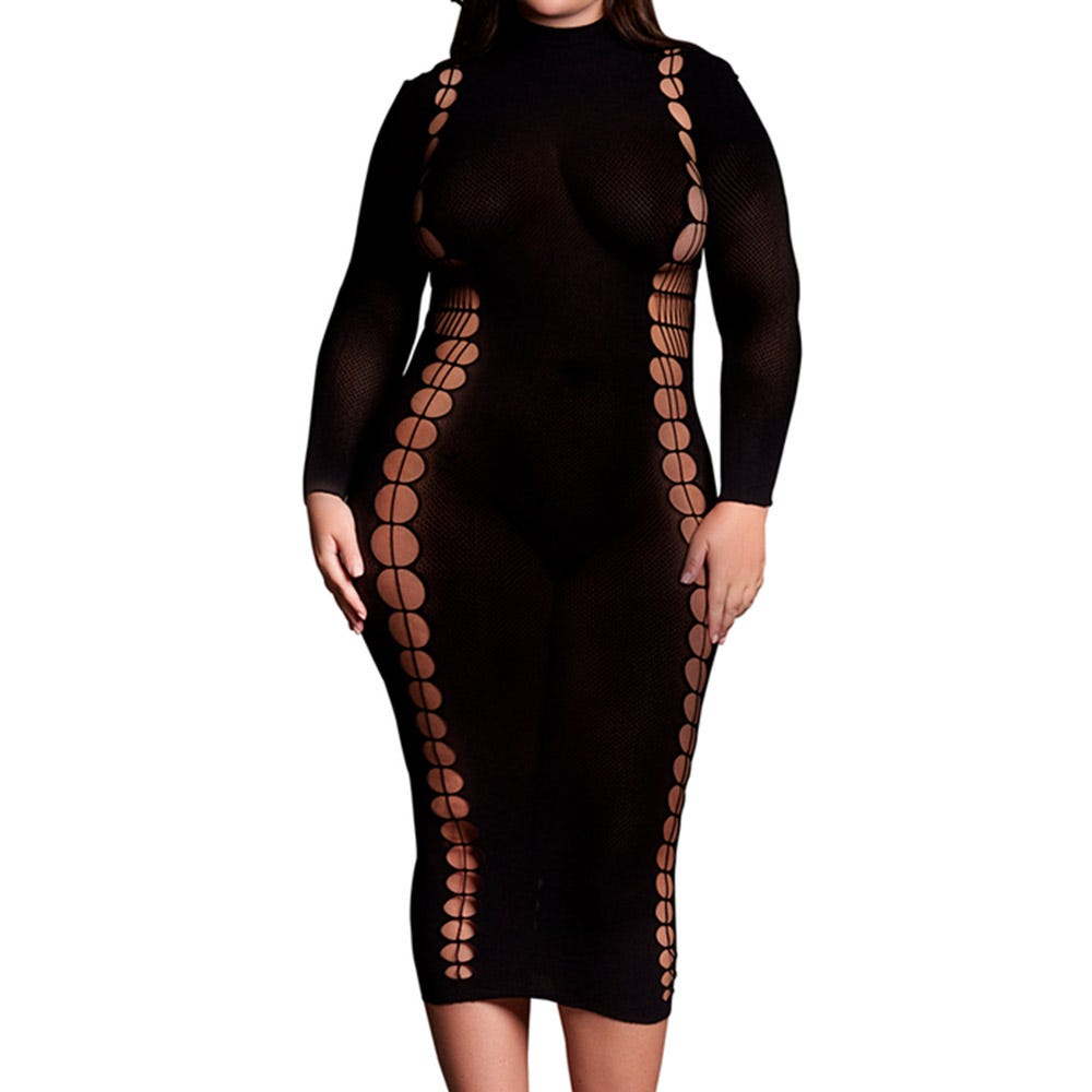 Step into the boardroom of desire with the Le Desir Carme Turtleneck Dress that combines power with sensuality in black fishnet fabric. The high turtleneck and long sleeves exude elegance, juxtaposed with the dress's daring cut with open net panels along the sides and an inverted open net triangle at the back that not only sculpts your figure into a coveted hourglass shape but allows a tempting glimpse of your derriere. Stretchy premium materials ensure comfort without sacrificing style, flattering a wide range of sizes. In Carme, you're armed for seduction.