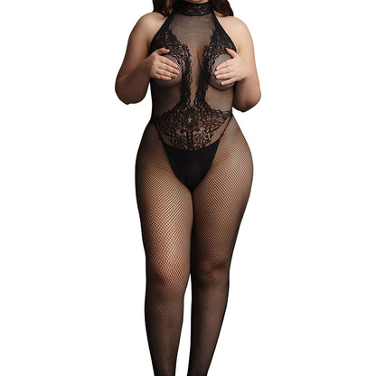 Get ready to set hearts racing with this scandalously sexy Le Desir Fishnet & Lace Bodystocking, with its high halter neck that draws eyes upward, and its cheeky open crotch that brings them right back downwards again. From neck to toe, this daring number leaves just enough to the imagination to drive admirers wild. Mostly fashioned from tantalising fishnet, it's also adorned with beautiful lace patterning that strategically frames your cleavage, adding a touch of elegance. Crafted with ample stretch to flatter voluptuous figures from XL to 4XL, this bodystocking ensures every luscious curve is celebrated in style. Thong not included.