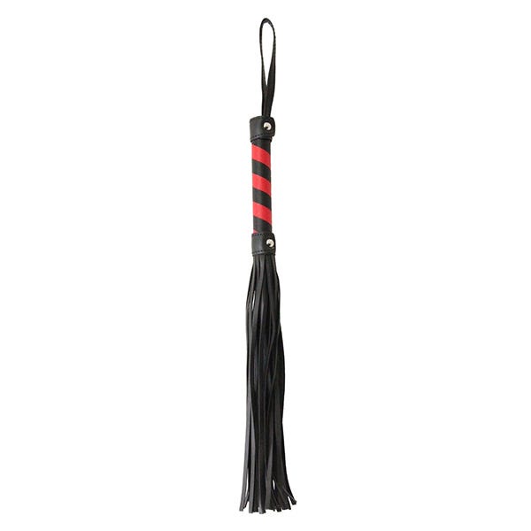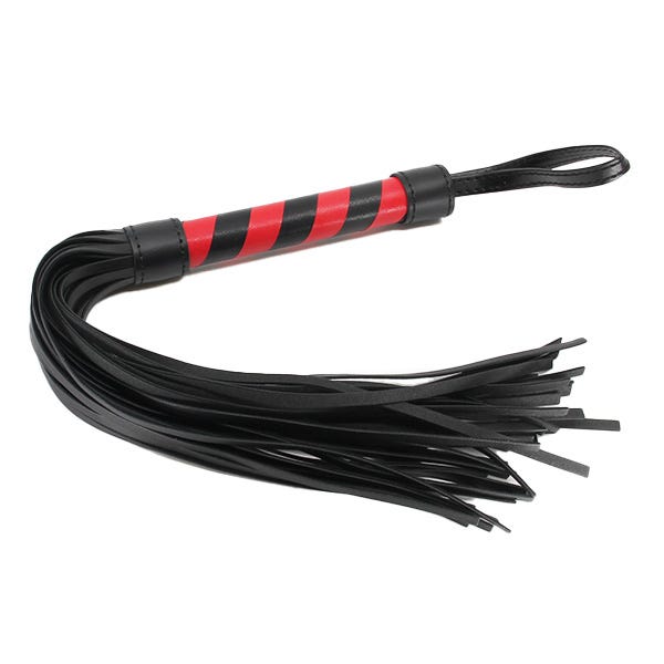 Deliver stings sweet as candy with this Love In Leather candy-striped faux leather striped flogger. Made from soft, vegan-friendly faux-leather, it features a red and black candy-striped handle, plus contrasting red stitch and silver stud details, making for an eye-catching design. The wooden-core handle and 13cm long wrist loop create a secure grip when flogging your lover.