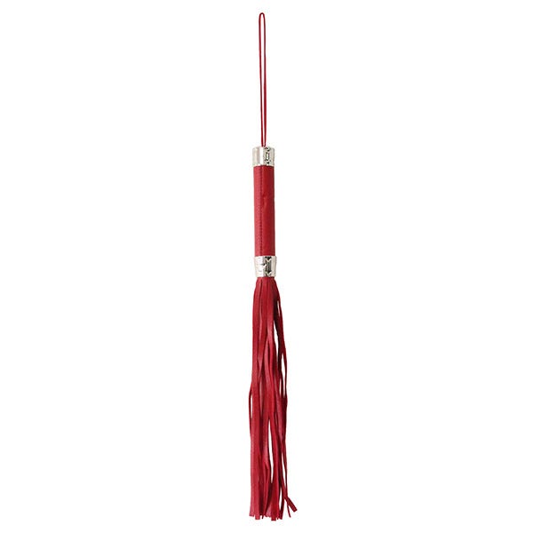 Add some red-hot fun to the bedroom with this Love In Leather red metal-trim faux leather flogger. With luxuriously soft faux leather in a daring red, this flogger features heart-imprinted silver hardware, and can be used to tickle and tease or lash your lover. A solid wood-core handle and 16cm long looped wrist strap offer added support when flogging.