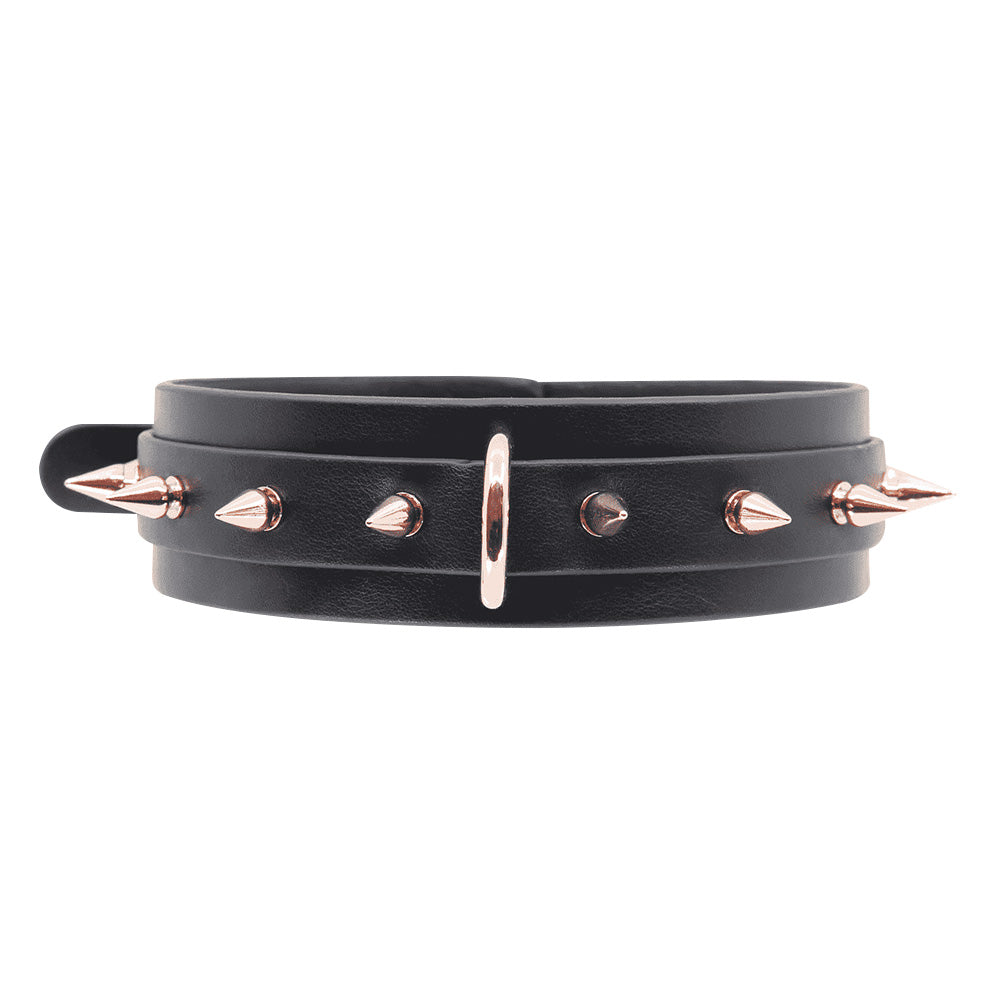 The purrfect accessory for frisky felines who adore a little roughness with their affection, this spiked collar is crafted from premium faux leather with gold-tone hardware. With a row of gleaming spikes that add a deliciously dangerous edge and an adjustable buckle closure with centre D-ring, this spiked faux leather collar is designed for comfort and control. Pair it with the matching leads and restraints for the complete Christian Gray-inspired ensemble.