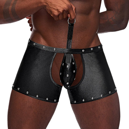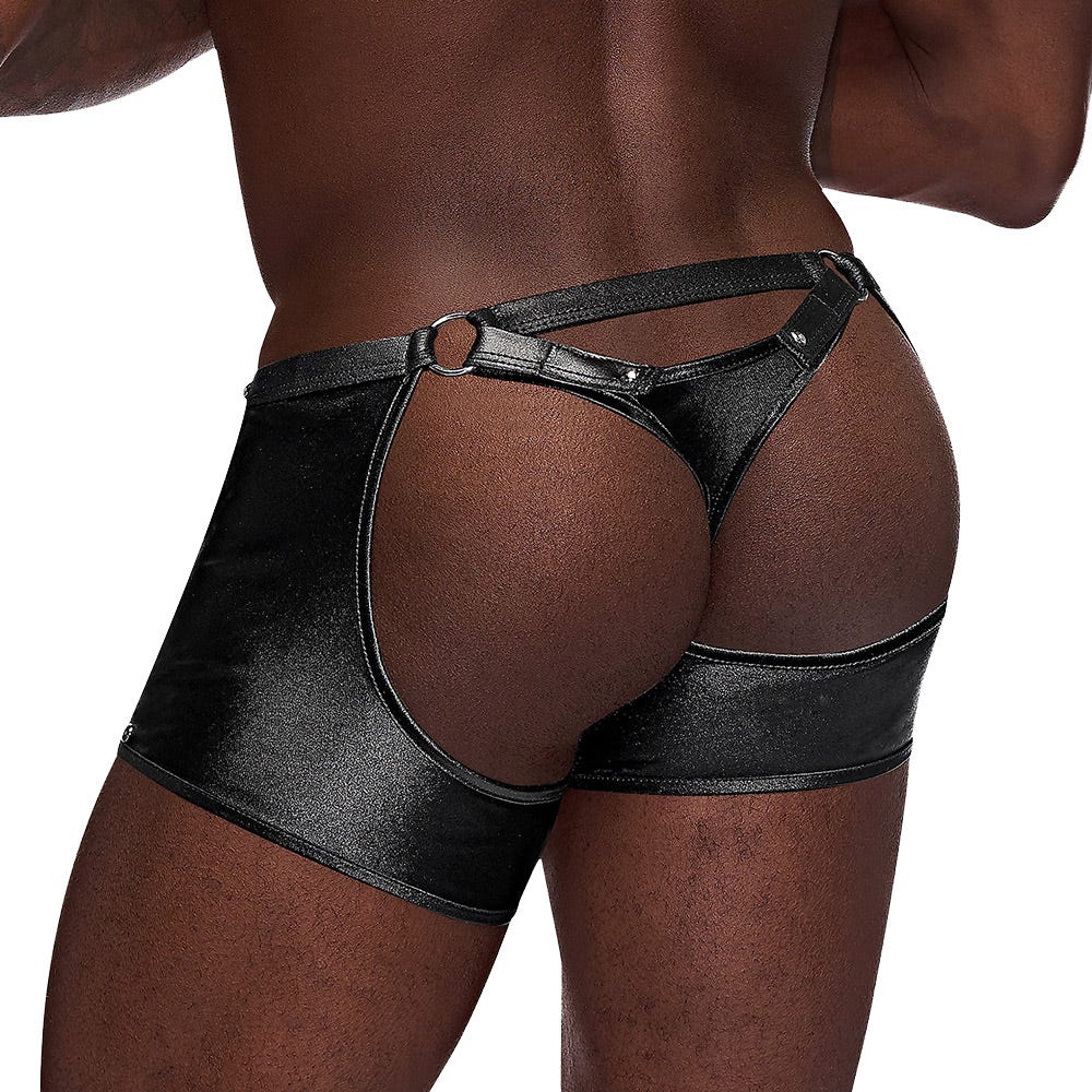 Unleash the power of the seas with the Malepower Poseidon Thong Shorts! Indulge in the feeling of the black studded leather-look panels that hug your thighs like waves on a shoreline. The crotchless and backless design with detachable Velcro thong lets you adjust your level of modesty faster than Poseidon can summon a storm. Let your lover tug on the metal ring that stands ready to harness your trident of passion - the options abound. Whether you're ruling the bedroom or making waves at a private beach, these shorts will ensure you're the catch of the day.
