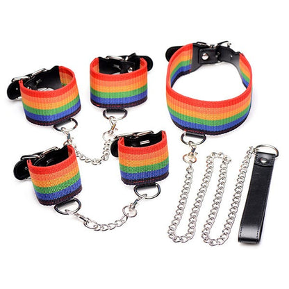 Put your submissive side on show proudly with this kinky Pride rainbow bondage set. Featuring a set of colourful wrist cuffs, ankle cuffs and a collar with detachable chain, you can lead your lover into some exhilarating moments of BDSM exploration. Beginner-friendly and oh-so-fun, each cuff also comes with a convenient D-ring to make it possible to take your play further and secure your lover to a mattress restraint system.