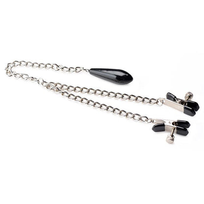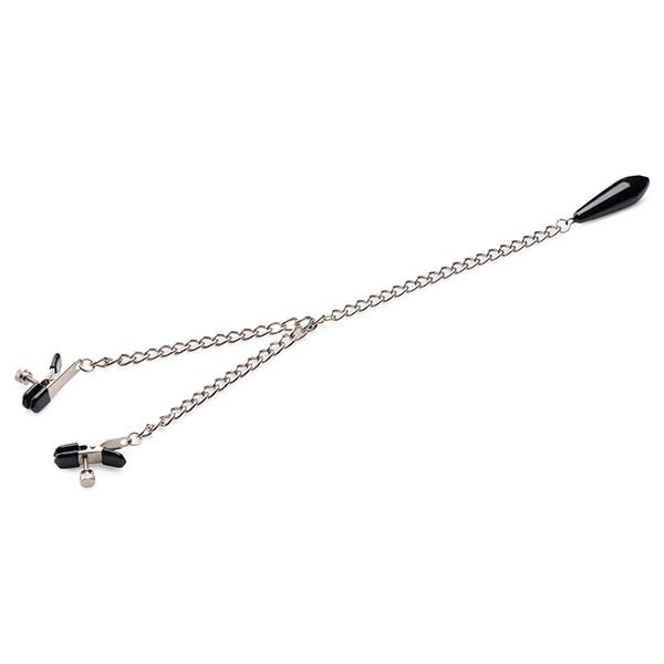 Secure up your seductress by the nipples with this tantalising titty taunter nipple clamps device. The rubber-coated clamps supply a satisfying pinch without unnecessary discomfort, while the weighted bead design provides a little pull to delight your delicates. Ideal for BDSM and bondage enthusiasts, these nipple clamps cater to all experience levels and can be adjusted by twisting the screws to keep the clamps securely in place on the nipple. The sleek and polished chain adds a touch of dungeon-inspired style, perfectly complementing your collection of bondage accessories.