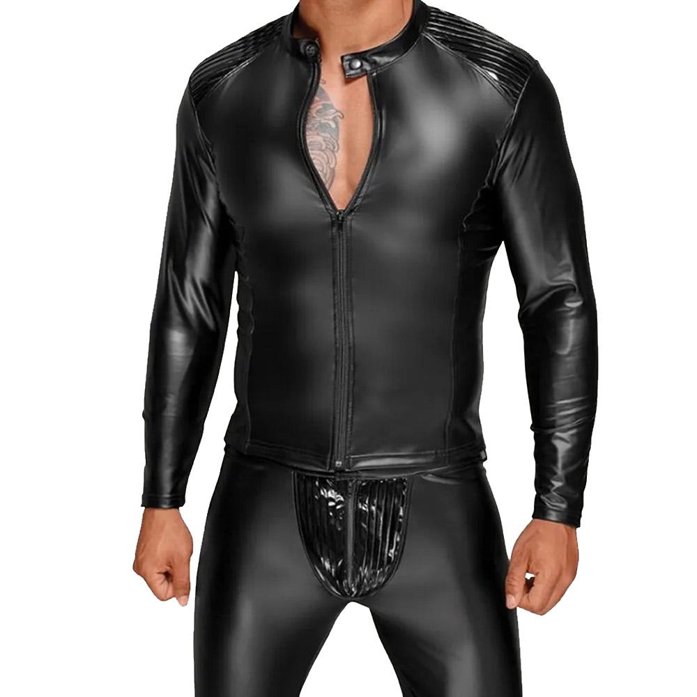 This power wet look jacket channels a rebellious and sexy vibe with its motorcycle-inspired design. The jacket is accentuated with bold epaulets crafted from pleated PVC, adding a striking visual contrast to the sleek material. A black full-way zipper slices through the front for an adjustable and custom fit, while the collar is neatly secured with a clasp, giving a nod to classic biker aesthetics.