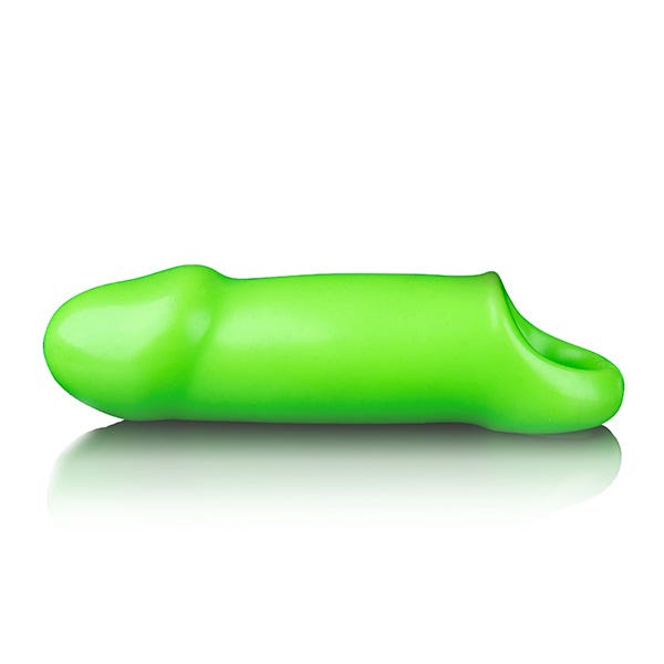 It's your turn to shine. Slide this thick, stretchy penis sleeve over your shaft to give you a couple of extra inches with firm and flexible support for optimal stimulation. Designed with a ball strap to keep the sleeve in place, you can jackhammer all night long without missing a beat. Charge your glow-in-the-dark phallus in sunlight or under a bright light and it'll glow well into the night.