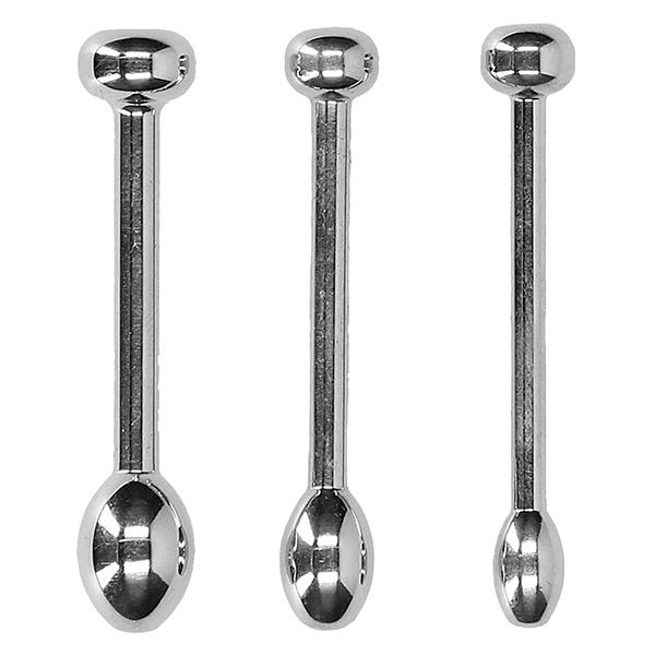 Crafted from solid, weighty stainless streel, these sounding plugs will stretch and stimulate you in all the right ways. The three-set features graduating sizes, each with an oval-shaped tip to prevent any too-deep penetration. Each plug weighs 21g, and is 4.9cm in length. Their width is 0.8cm, 0.9cm, and 1cm.
