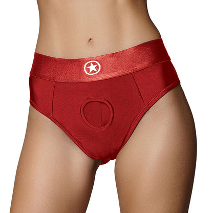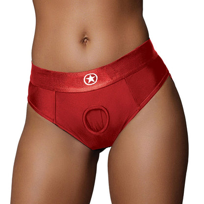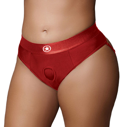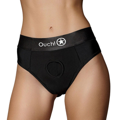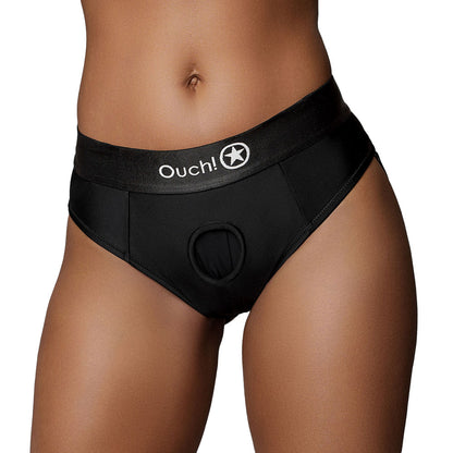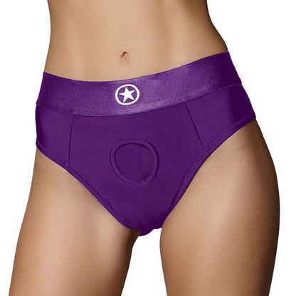 Bring on the good vibrations with this stretchy strap-on thong with removable rear straps and rechargeable bullet. This strappy ensemble features a thong back that reveals your assets, plus removable straps for extra support when packing or pegging. Slip the included bullet vibe into the built-in pockets for added buzz. Adjust the O-ring for a secure fit with your favourite toy. Add water-based lube and get ready for playtime, your way.