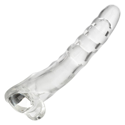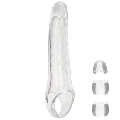 Add extra length and girth to your natural assets with the Performance Maxx Clear Ridged Extension Kit, a CalExotics essential for taking your intimacy to new heights. Delivering out-of-this-world pleasure for you and your partner, the ultra-soft, stretchy TPR sleeve boasts a realistic hollow design with a textured shaft full of tantalising ridges. Three removable stoppers allow you to customise the fit, while the built-in ballstrap keeps everything in place during your wildest sessions. On top of it all, the totally transparent design lets you both watch every delicious detail unfold.