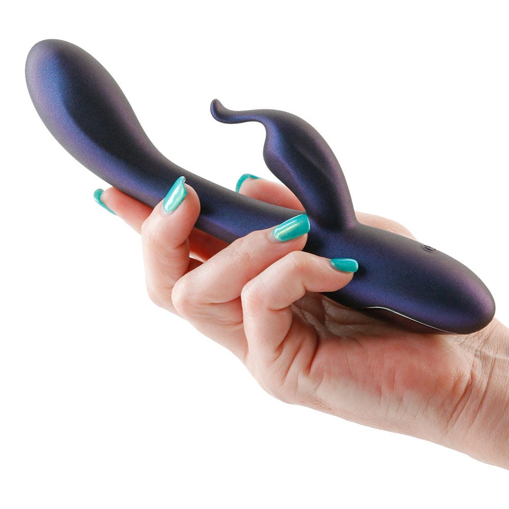 Indulge in regal pleasure with this metallic blue rabbit vibrator. The Royals Empress is a glamorous addition to your beside arsenal. Featuring a shimmering silicone finish, multiple speeds and explosive functions for a truly royal experience, this blue rabbit vibrator is rechargeable and compatible with all lubricants. The Empress is your faithful servant in the realm of pleasure.